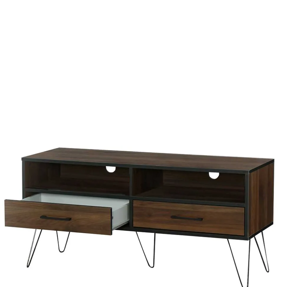 Das TV Board bietet zwei geräumige Schubladen mit Metallauszug für Zubehör wie Fernbedienungen oder DVDs. Zwei offene Gerätefächer sorgen für eine ordentliche Platzierung von Mediengeräten, während die Löcher in der Rückwand eine unkomplizierte Kabelführung ermöglichen.