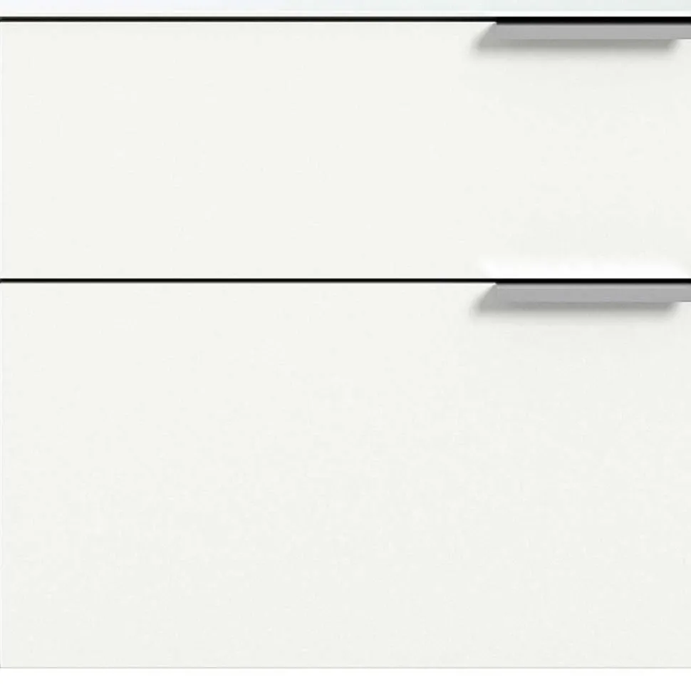 Gefertigt aus robuster Spanplatte, punktet das TV-Element durch seine langlebige Verarbeitung. Die Deckplatte mit weißem Siebdruckglas (3 mm Stärke) verleiht dem Möbel nicht nur optische Raffinesse, sondern schützt auch die Oberfläche zuverlässig. Dezente Aluminium-Kantengriffe fügen sich unauffällig in das Gesamtbild ein, während silberfarbene Kunststoff-Bodengleiter für einen sicheren Stand sorgen.