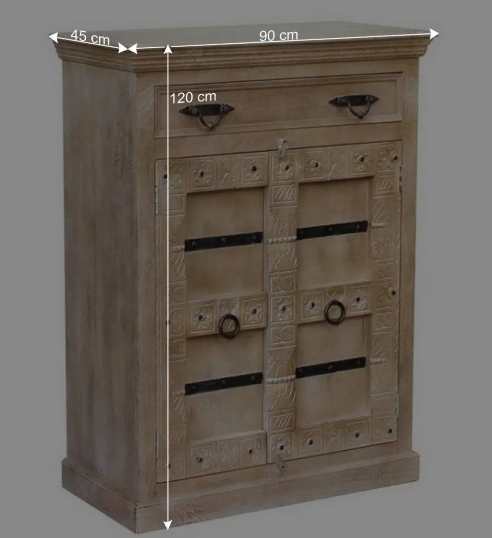 Unser Schuhschrank „Abid“ zeichnet sich durch hervorragende Material- und Verarbeitungsqualität aus. Die überstehende Deckplatte ist aufwändig gefräst und verleiht dem Schrank eine markante Präsenz. Die reich verzierte Front ist mit plastischen Strukturen und Nieten sowie Beschlägen aus Metall verziert, was ihn zu einem wahren Blickfang macht.