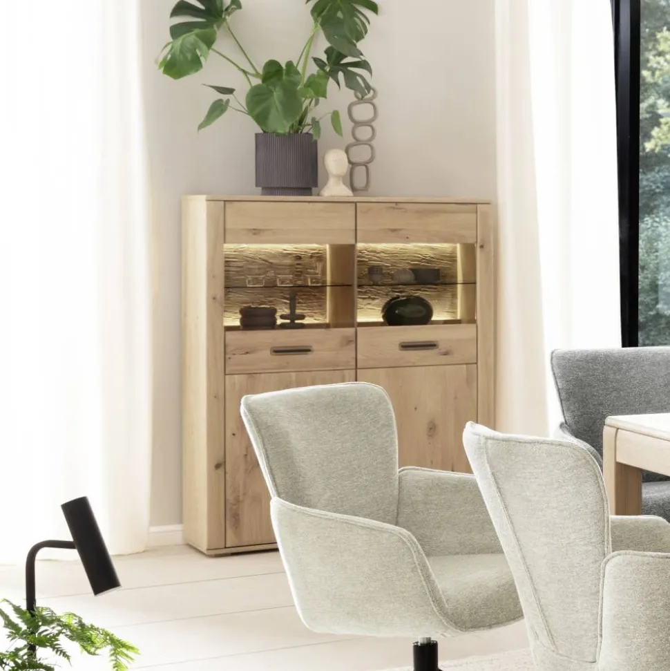 Der Vitrinenschrank „Jevedaz“ kombiniert moderne Eleganz mit hochwertiger Verarbeitung. In heller Asteiche gehalten, bringt er eine warme und einladende Atmosphäre in Ihren Wohnraum. Durch die integrierte Beleuchtung und die geschmackvolle Gestaltung wird er zum perfekten Möbelstück für eine stilvolle Präsentation.