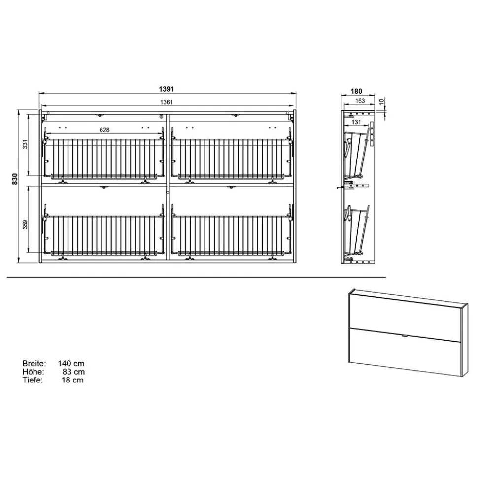 - Innen befinden sich vier Metall-Schuhkörbe, Platz für ca. zwölf Paar Schuhe