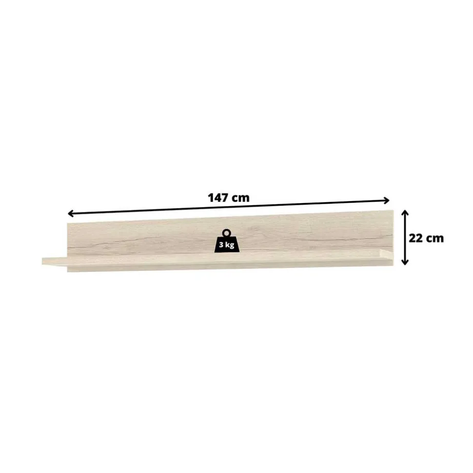 Mit einer Breite von 147 cm, einer Höhe von 22 cm und einer Tiefe von 24 cm bietet das Wandregal ausreichend Platz für Bücher, Dekorationen oder Pflanzen. Die Ablagefläche ist bis zu 5 kg belastbar, sodass Sie problemlos auch schwerere Gegenstände sicher darauf abstellen können. Das Regal passt sich mit seiner schlichten und modernen Optik jedem Raum an und ist eine praktische Ergänzung für Wohnzimmer, Schlafzimmer oder Flur.