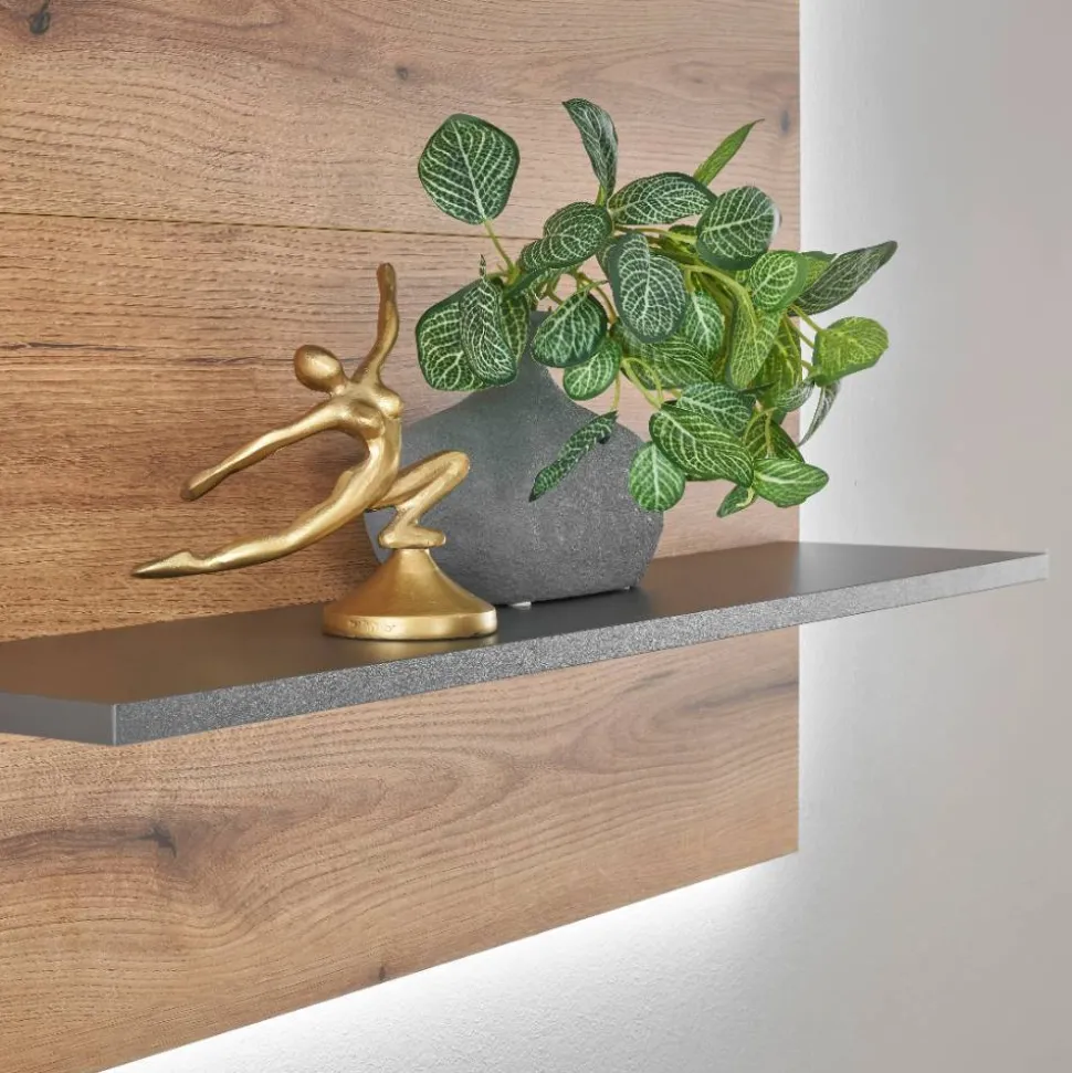 Flexible Ablageflächen Das Paneel verfügt über zwei Ablageböden in Anthrazit mit einer Tiefe von 18 cm und Breiten von 140 cm und 85 cm. Beide Böden sind rechts- oder linksbündig montierbar und bieten Platz für Bilderrahmen, Vasen oder andere dekorative Elemente. Die maximale Belastbarkeit beträgt 3 kg pro Boden.