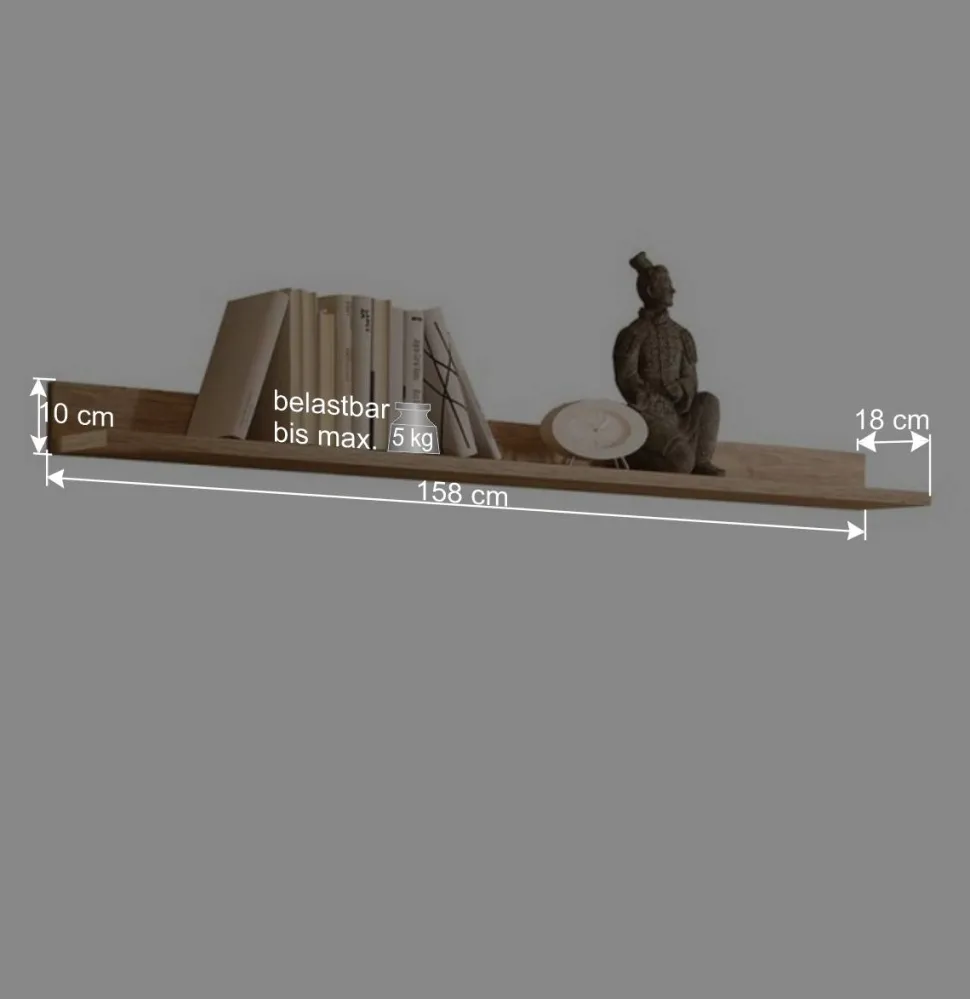 Mit seinen Maßen von 158 cm Breite, 10 cm Höhe und 18 cm Tiefe ist das Wandboard „Rodonda“ äußerst vielseitig einsetzbar. Ob im Wohnzimmer, Schlafzimmer oder Flur, es bietet ideale Ablagemöglichkeiten für Bücher, Deko-Elemente oder alltägliche Gegenstände. Der Ablageboden hält bis zu 5 kg Gewicht und bietet somit ausreichend Stabilität für Ihre Lieblingsstücke.