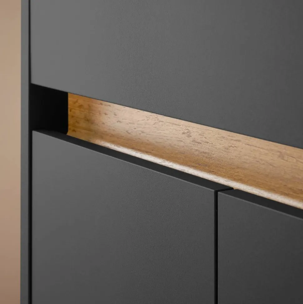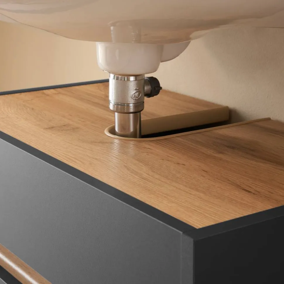Der Waschbeckenunterschrank „Ahilav“ setzt auf klare Formen und starke Kontraste. Die anthrazitfarbene Front wirkt reduziert und modern, die zurückgesetzte Blende in Wildeiche-Optik bringt Struktur und Wärme ins Spiel. Ein Möbelstück für alle, die im Bad auf Understatement mit Funktion setzen.
