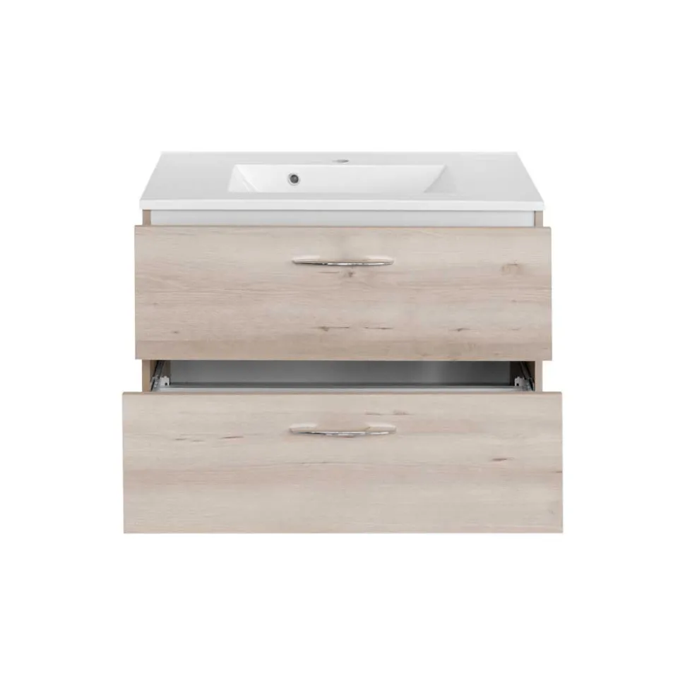 Mit einer Breite von 80 cm, einer Höhe von 54 cm und einer Tiefe von 48 cm nutzt der Waschtisch den vorhandenen Platz optimal aus und bietet dennoch genügend Stauraum für alle wichtigen Badutensilien. Zwei großzügige Schubladen mit langlebigem Metallauszug ermöglichen komfortables Öffnen und Schließen selbst bei voller Beladung. Die durchdachten Innenmaße von knapp 70 cm pro Schublade schaffen Raum für Handtücher, Kosmetik oder Reinigungsmittel – alles ordentlich verstaut und stets griffbereit. Ein praktischer Siphonausschnitt in der oberen Schublade sorgt dafür, dass der verfügbare Platz bestmöglich genutzt werden kann, ohne dass Installationen stören. Die offene Rückseite des Waschtischs erleichtert zudem die Montage erheblich, besonders bei bereits vorhandenen Anschlüssen oder baulichen Besonderheiten.