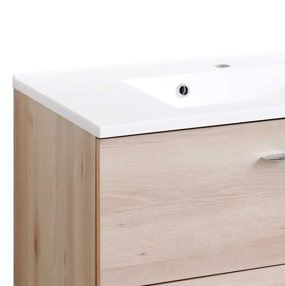 Modern, geradlinig und funktional – der Waschtisch Mabeca setzt stilvolle Akzente in jedem Badezimmer. Mit seiner wohnlichen Farbgebung in Buche hell bringt er natürliche Wärme in den Raum und überzeugt gleichzeitig durch eine klare, zeitlose Formsprache. Inspiriert vom modernen Wohnstil, verbindet das Design schlichte Eleganz mit praktischer Alltagstauglichkeit. Die harmonisch abgestimmte Optik wird durch zurückhaltende Metallgriffe abgerundet, die sich unaufdringlich in das Gesamtbild einfügen. Wer auf moderne Leichtigkeit und langlebige Qualität Wert legt, trifft mit diesem Waschtisch eine hervorragende Wahl – gefertigt in Deutschland, sorgfältig verarbeitet und mit hochwertigen Materialien ausgestattet.