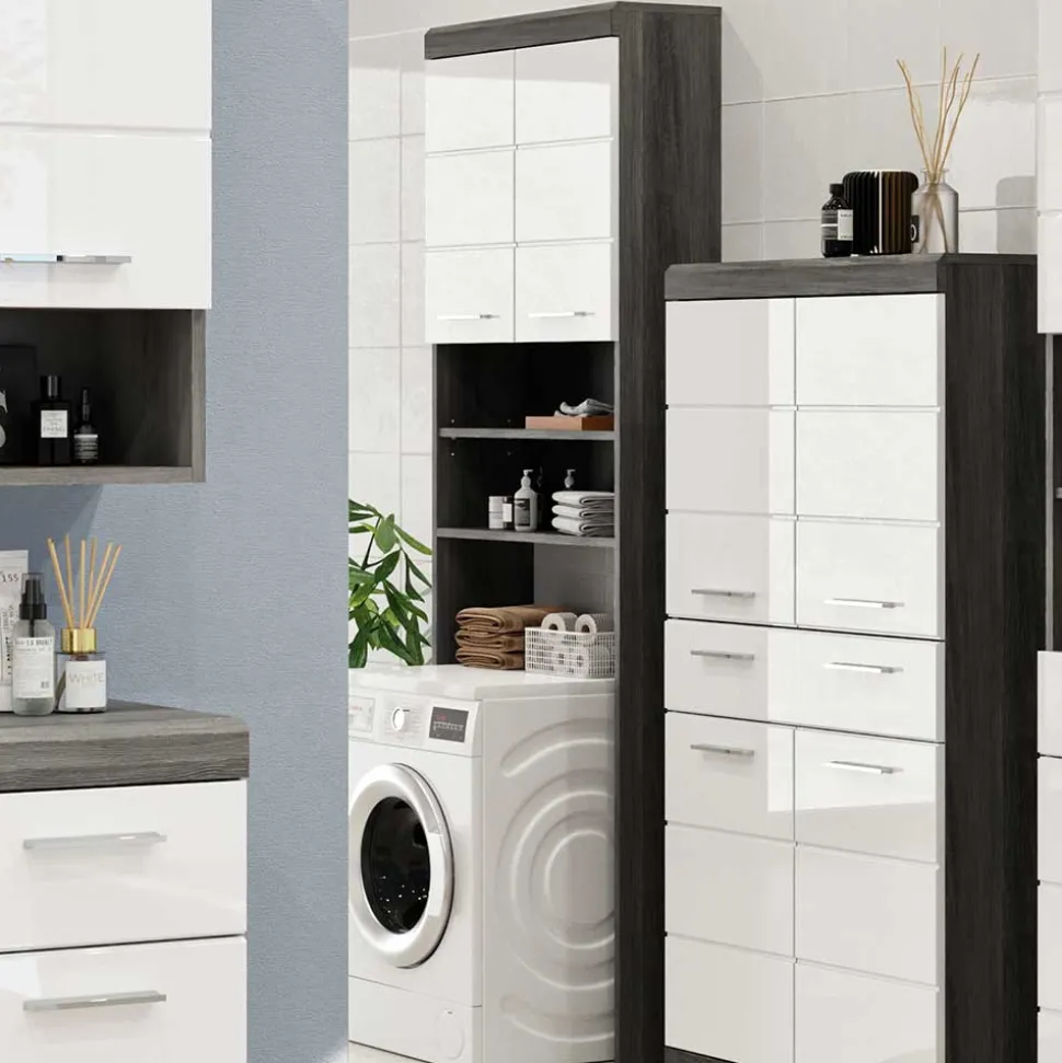 In einer zeitgemäßen Kombination aus klassischem Weiß und edlem Rauchgrau bringt dieser Waschmaschinenschrank frischen Wind in jedes Bad oder jeden Hauswirtschaftsraum. Die Fronten sind hochglänzend gearbeitet und mit einem eleganten Rillendekor versehen – feine, vertikale Linien, die dem Möbelstück Struktur und Tiefe verleihen. In Verbindung mit der ruhigen Holzoptik in Rauchgrau ergibt sich ein harmonisches Gesamtbild, das sowohl in moderne als auch klassische Einrichtungen passt.
