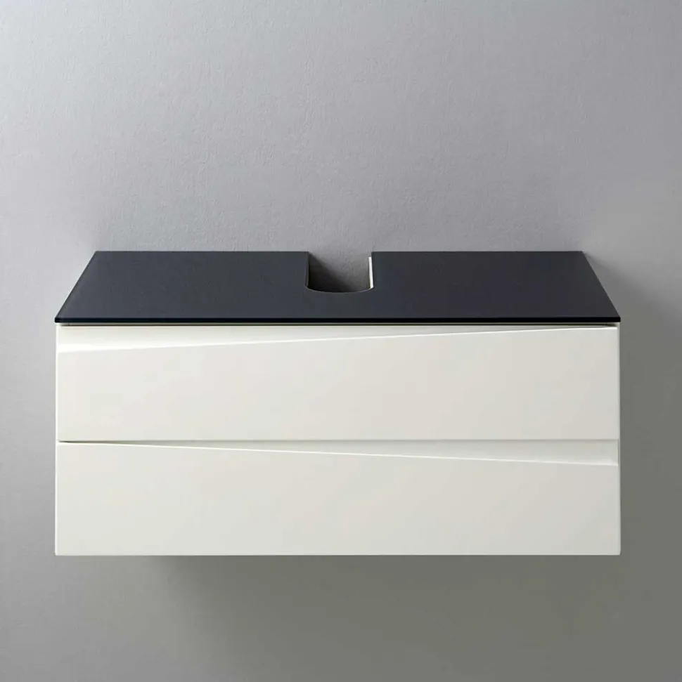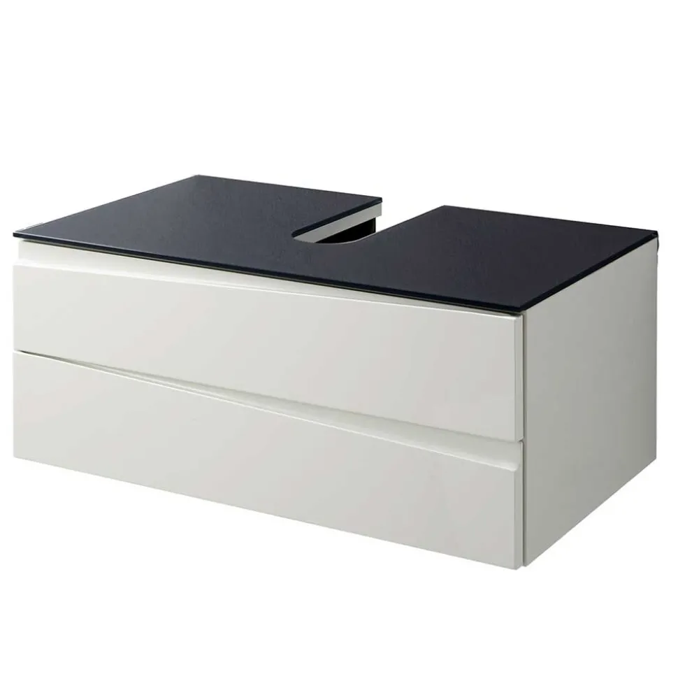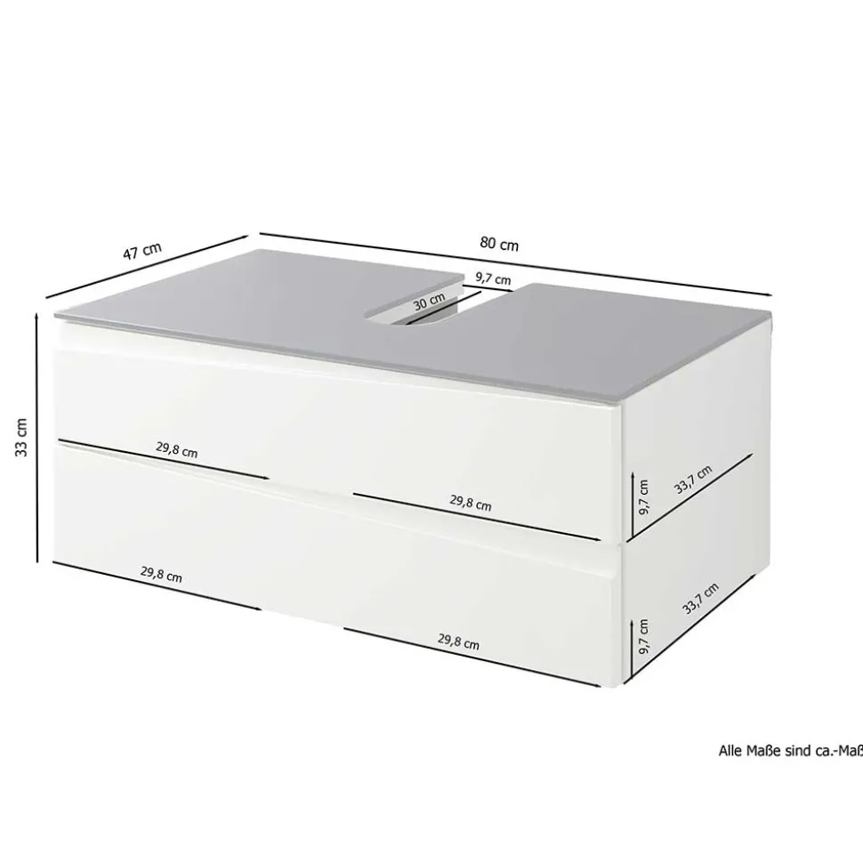 Die Lieferung der Waschtisch-Konsole „Impulse“ erfolgt ohne Armaturen, Ablaufgarnitur und Waschbecken. Ein vorgefertigter Siphon-Ausschnitt (Maße: ca. 9,7×30 cm) erleichtert die Installation. Die Innenmaße der Schubladen betragen jeweils ca. 29,8×9,7×33,7 cm. Mit einer Breite von 80 cm, einer Höhe von 33 cm und einer Tiefe von 47 cm fügt sich die Konsole harmonisch in Ihr Badezimmer ein.
