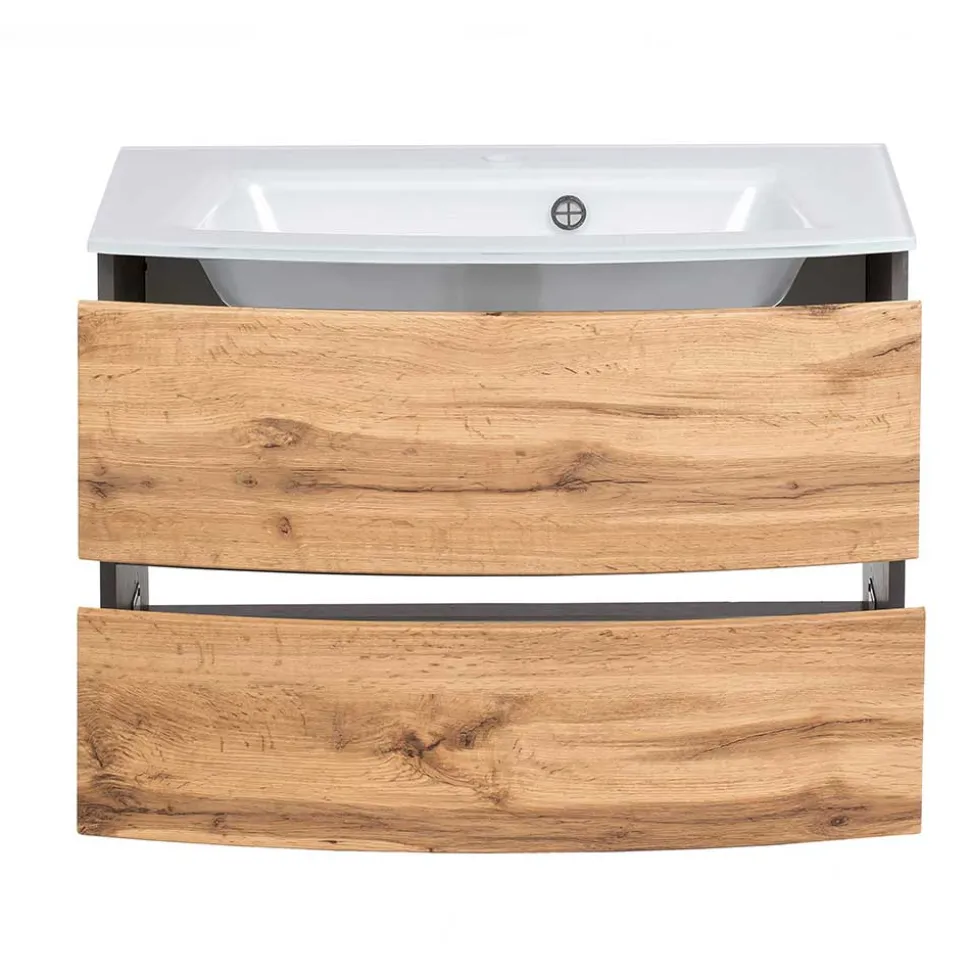 Die Fronten bestehen aus stabilem MDF, das in realistischer Holzoptik Wildeiche foliert ist. Dieses Verfahren ermöglicht eine authentische Maserung mit angenehmer Haptik, während die Oberfläche pflegeleicht und widerstandsfähig bleibt. Der Korpus ist aus robuster Spanplatte gefertigt und mit einer hochwertigen Melaminbeschichtung in Dunkelgrau versehen. Melamin sorgt für eine geschlossene, glatte Oberfläche, die Feuchtigkeit trotzt und besonders leicht zu reinigen ist. So bleibt Ihr Waschtisch auch nach Jahren noch makellos schön.