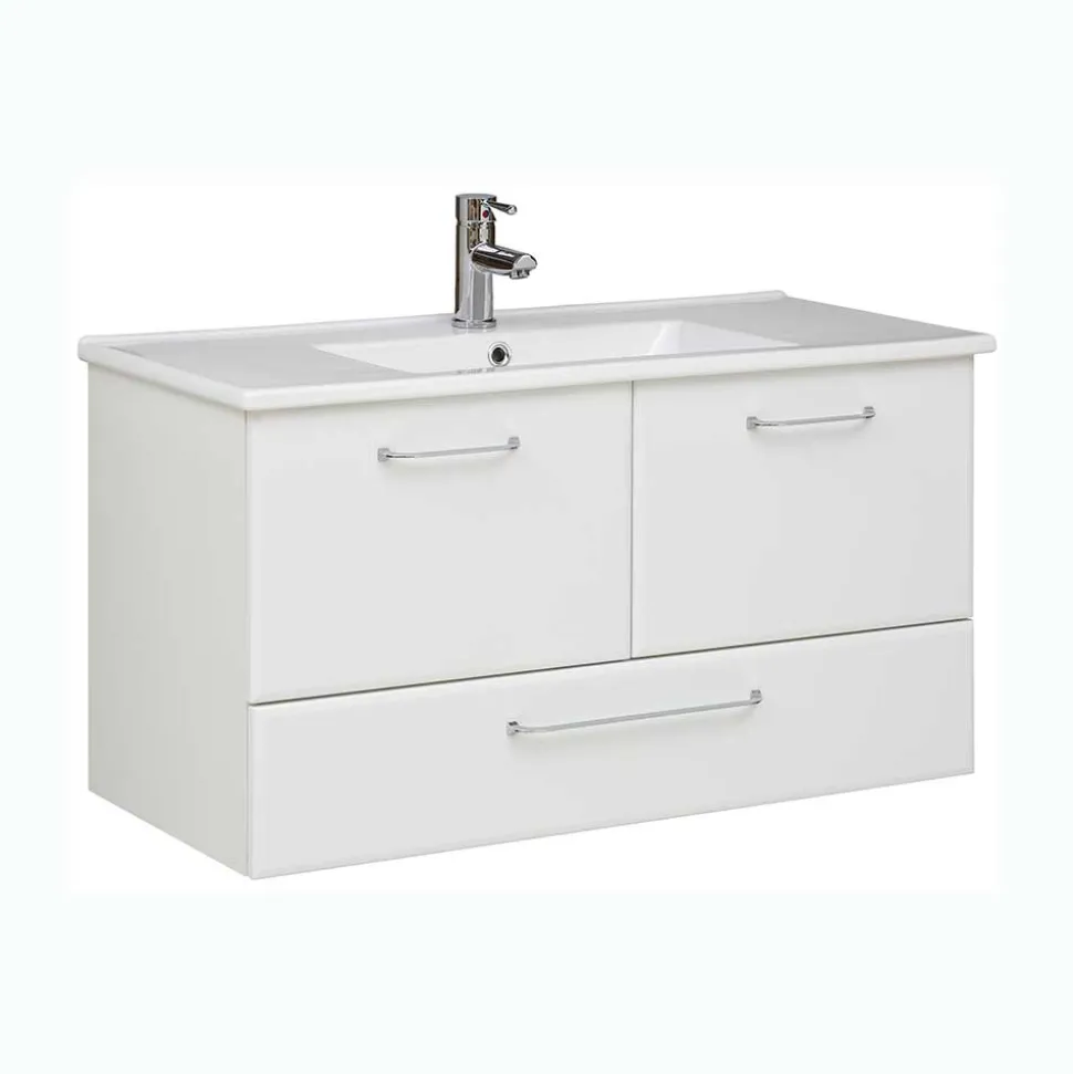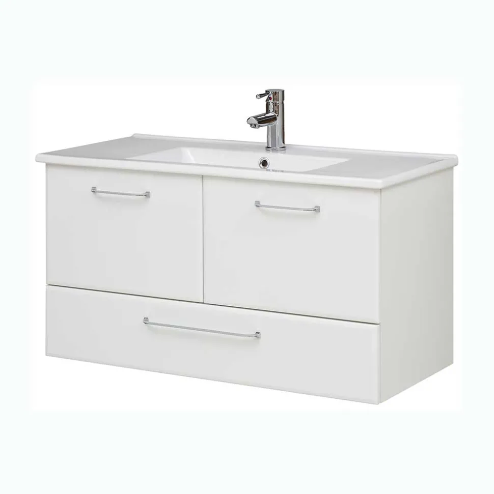 Für den Korpus der Waschtisch-Konsole „Estateas“ wurde robuster Holzwerkstoff (Spanplatte) verwendet. Die Materialstärke von 16 mm garantiert eine hohe Stabilität und Langlebigkeit. Eine weiße Melaminharz-Oberflächenbeschichtung schützt die Konsole und verleiht ihr pflegeleichte Eigenschaften: Die Oberfläche ist kratzfest und widerstandsfähig gegen Feuchtigkeit. Die hochglänzende Front wurde durch ein Tiefziehverfahren gefertigt und besticht durch eine attraktive Optik, während stoßfeste ABS-Kanten für zusätzlichen Schutz sorgen. Ein glänzender Bügelgriff aus Chrom setzt elegante Akzente und unterstreicht die moderne Linienführung.