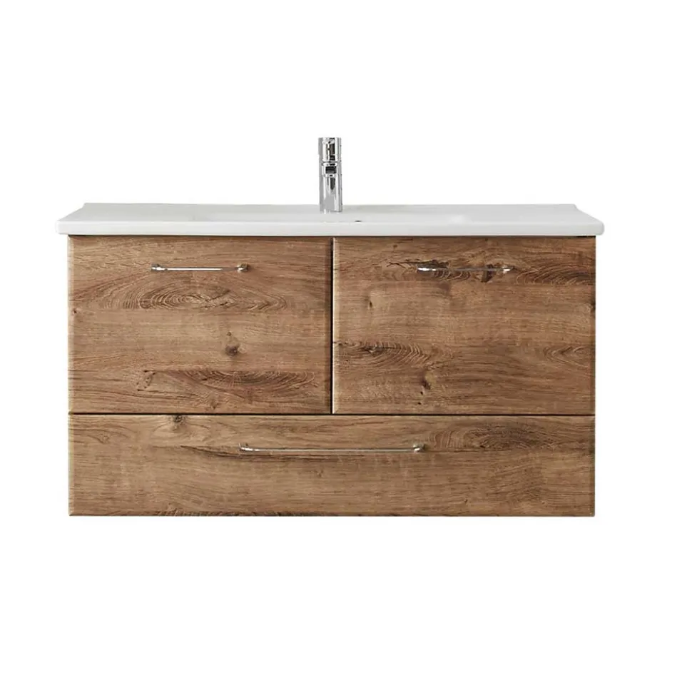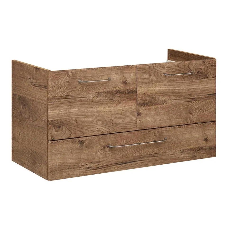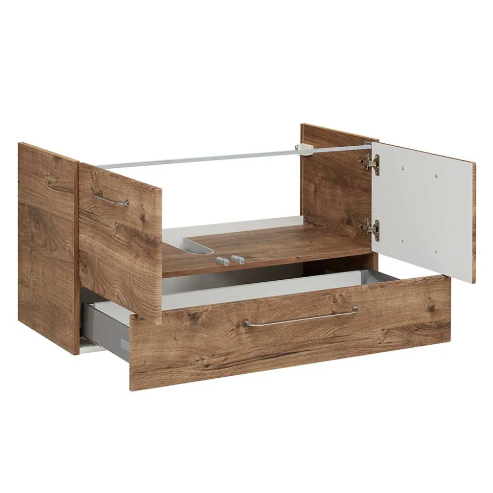 Für die Fertigung der Waschtischkonsole kommt robuster Holzwerkstoff in Form einer 16 mm starken Spanplatte zum Einsatz. Dank der Melaminharzbeschichtung in dunkler Eiche ist die Oberfläche besonders pflegeleicht, strapazierfähig und kratzfest. Die Front des Möbels ist tiefgezogen und wird durch stoßfeste ABS-Kanten ergänzt, die zusätzliche Stabilität bieten. Abgerundet wird das Gesamtbild durch stilvolle Bügelgriffe aus glänzendem Chrom, die dem Möbelstück eine besondere Note verleihen.