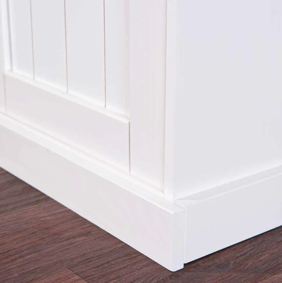 Aus massiver Kernbuche gefertigt, garantiert dieser Buffetschrank nicht nur eine exzellente Langlebigkeit, sondern setzt auch ein starkes Zeichen in Sachen Nachhaltigkeit und Umweltbewusstsein. Die Kernbuche ist bekannt für ihre außergewöhnliche Härte und Widerstandsfähigkeit, welche „Vatina“ eine unvergleichliche Robustheit verleiht. Die lebendige Maserung des Holzes sorgt für eine warme, einladende Atmosphäre, während die matte weiße Lackierung der Holzoberflächen in Kombination mit der braun lackierten Deckplatte und Ablagefläche das natürliche Erscheinungsbild hervorhebt und zugleich einen modernen Touch verleiht. Diese Lackierung schützt das Holz nicht nur effektiv, sondern erleichtert auch die Pflege und Reinigung des Möbelstücks.