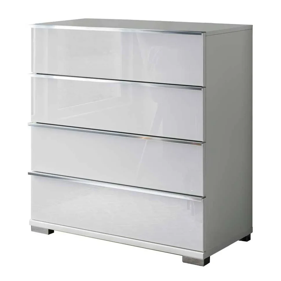 Bringen Sie frischen Wind in Ihr Zuhause mit der eleganten Kommode „Rocca“. Die Kombination aus weißem Glas und weißem Korpus sorgt für ein modernes und lichtdurchflutetes Ambiente. Die markante Gestaltung wird durch die durchgehenden Griffleisten aus Chrom und die flachen Metallfüße in rechteckigem Design ergänzt. Die pflegeleichte Glasfront ist sowohl funktional als auch stilvoll und fügt sich nahtlos in jede Wohnlandschaft ein.