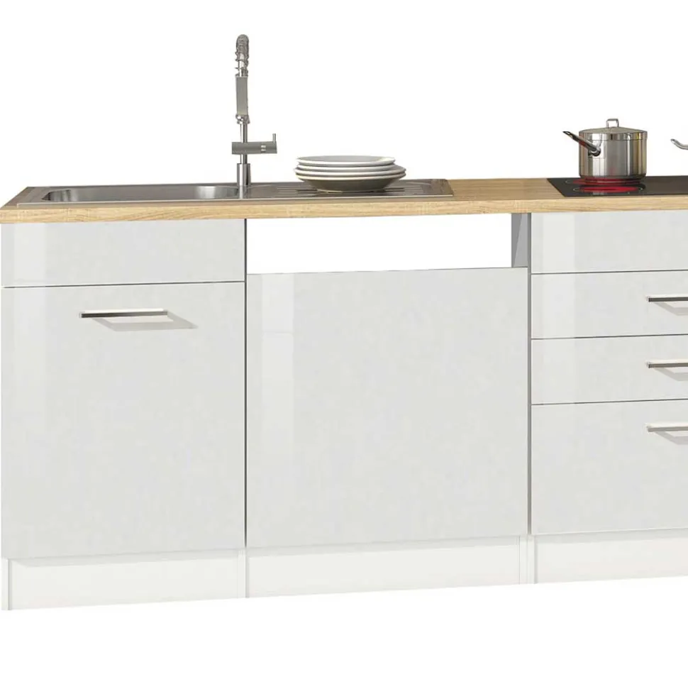 Neben Stauraum bietet die „Cuneo“ Küchenzeile auch praktische Lösungen für den täglichen Gebrauch. Der Spülenschrank ist mit einem pflegeleichten Spülbecken aus hochwertigem Edelstahl ausgestattet. Edelstahl ist nicht nur robust, sondern auch besonders hygienisch und pflegeleicht – Flecken lassen sich einfach entfernen, und das Material bleibt lange schön. Beachten Sie, dass Armatur und Arbeitsplattenausschnitt nicht im Lieferumfang enthalten sind, sodass Sie diese nach Ihren individuellen Vorlieben auswählen und integrieren können.
