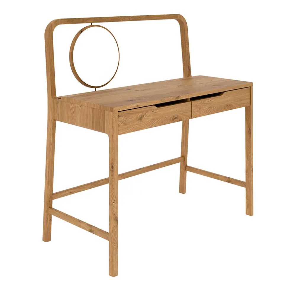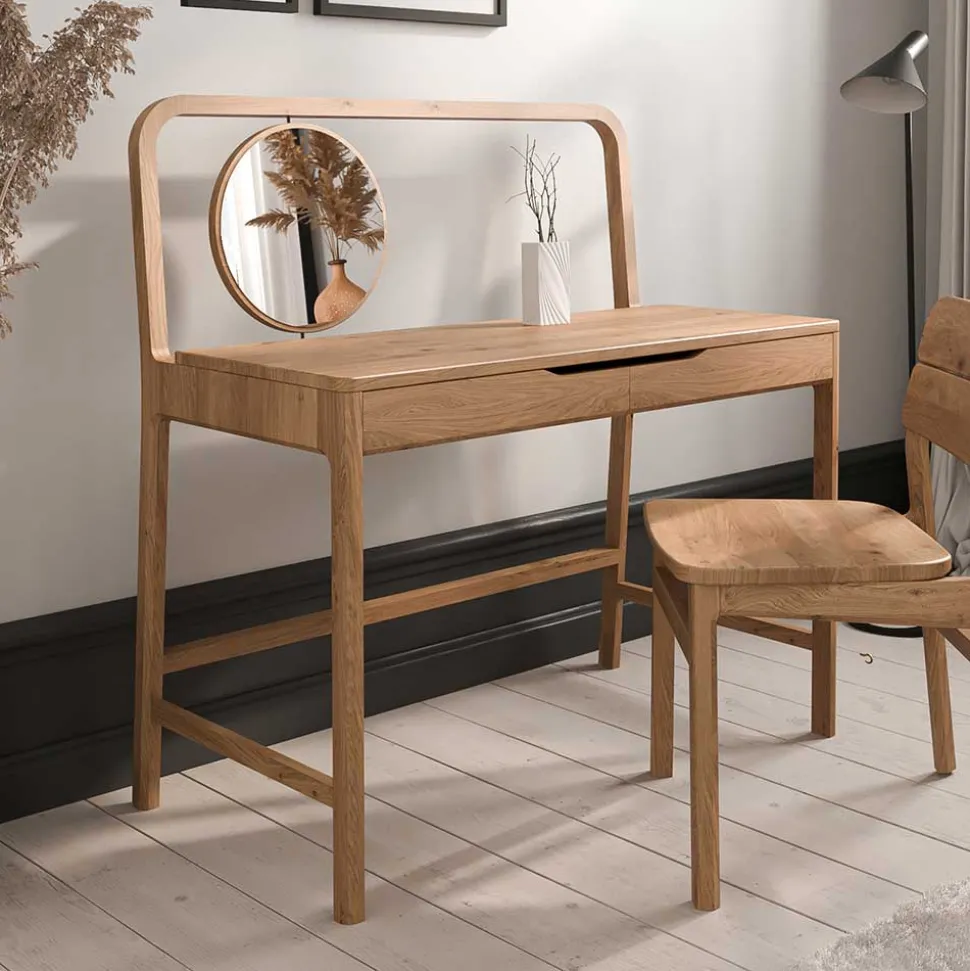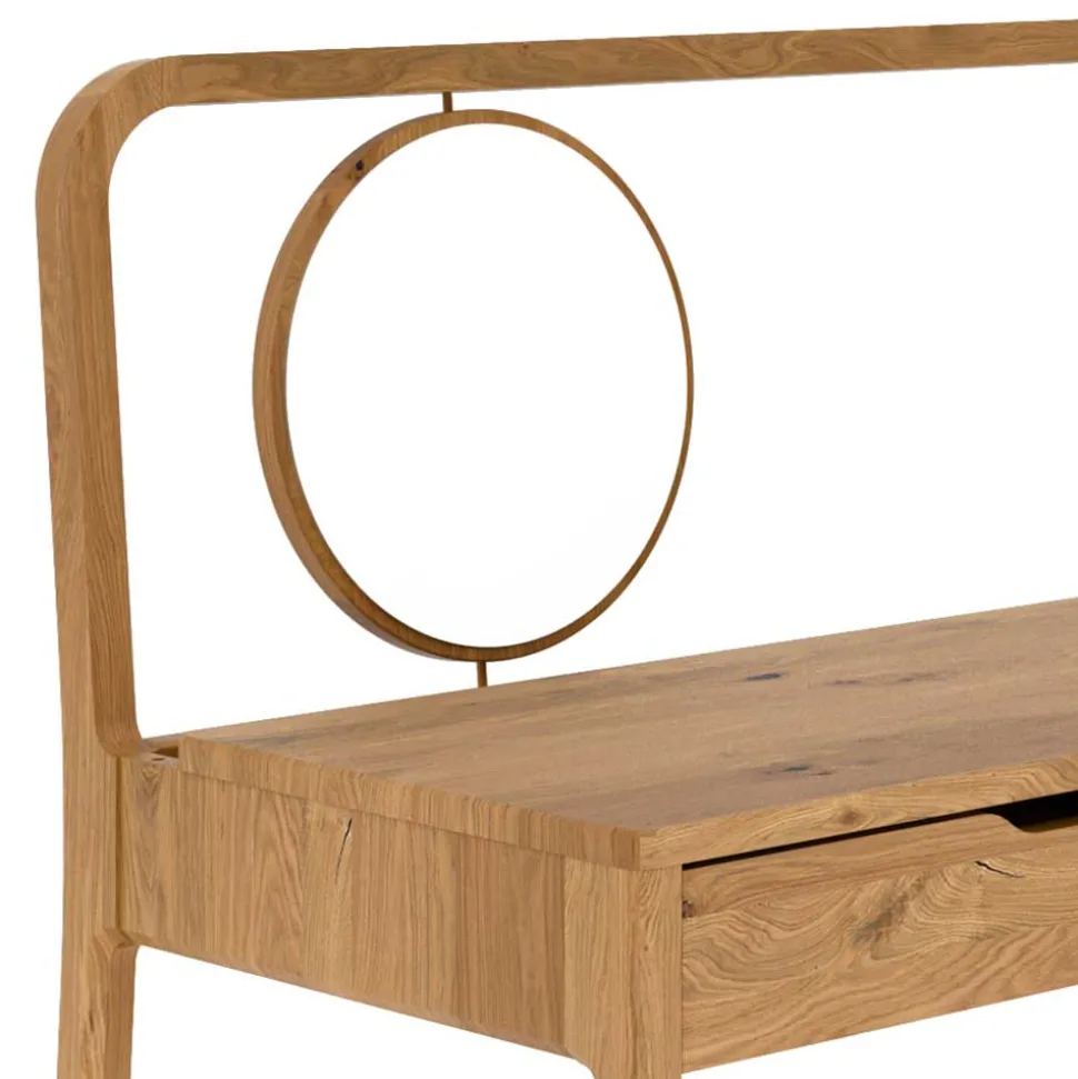 Ein stilvolles Möbelstück, das Funktionalität und Ästhetik perfekt vereint. Der Frisiertisch Laida begeistert mit seinem modern-natürlichen Design und bringt die Schönheit massiver Wildeiche in Ihr Zuhause. Durch die geölte Oberfläche wird die einzigartige Maserung des Holzes betont, wodurch jeder Tisch zu einem unverwechselbaren Unikat wird.