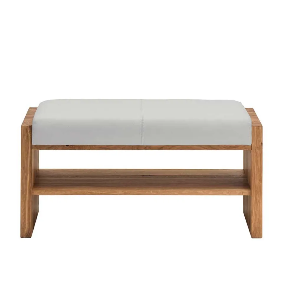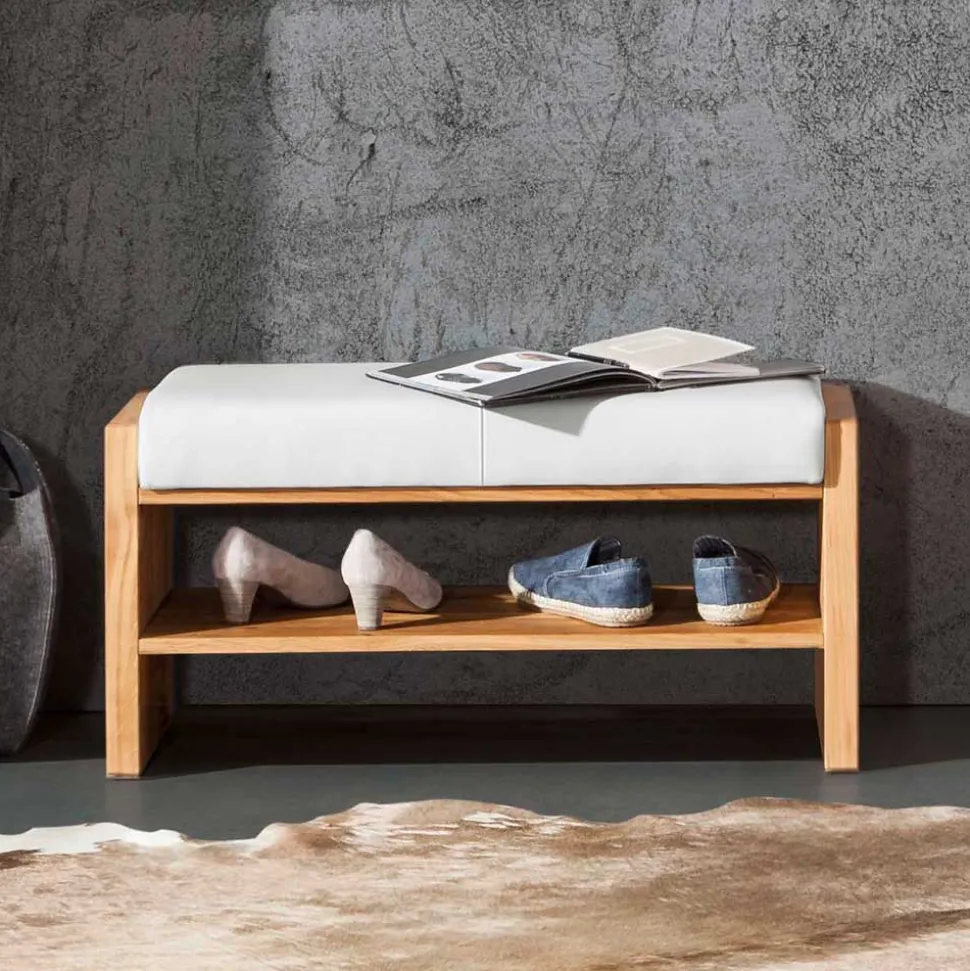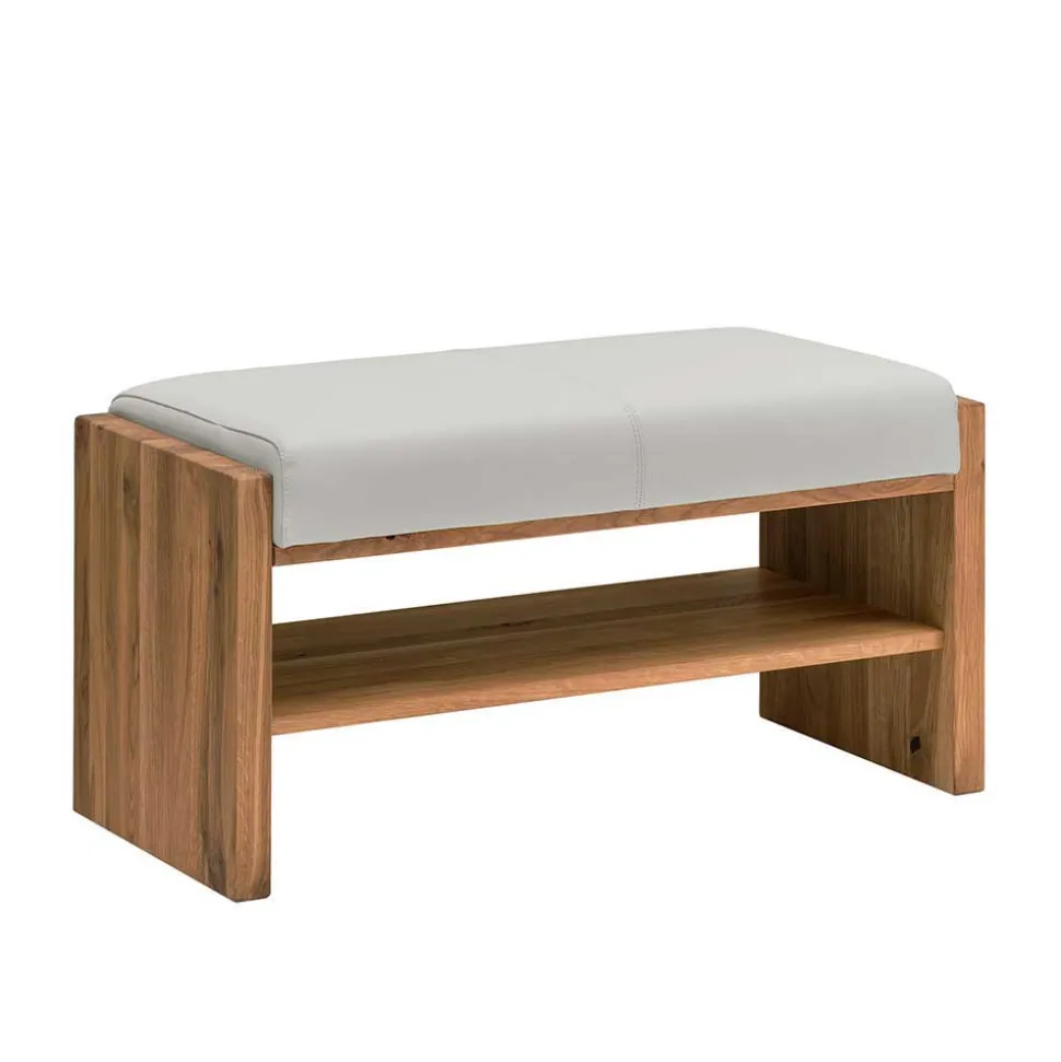 Die Schuhbank „Mandrey“ besteht aus massivem Wildeicheholz und Echtleder, was sie zu einem beeindruckenden Blickfang in Ihrem Eingangsbereich macht. Natürliche Wuchsmerkmale wie leichte Risse oder Astlöcher sind bewusst integriert und verleihen den Möbeln einen unverwechselbaren Charakter. Die gebürsteten und geölten Holzoberflächen betonen die lebhafte Maserung und verleihen der Schuhbank einen zeitgemäßen Look.