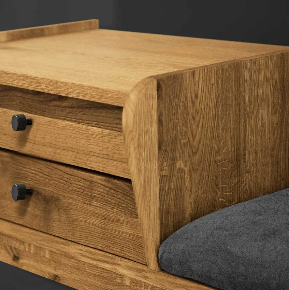 Links von der Sitzfläche befinden sich zwei praktische Schubladen mit Metallauszug und Soft-Close-Funktion. Diese Schubladen bieten nicht nur reichlich Stauraum für Ihre persönlichen Gegenstände, sondern schließen auch sanft und leise, was den täglichen Gebrauch noch angenehmer macht. Kein lästiges Knallen mehr – die Soft-Close-Funktion sorgt für ein leises und reibungsloses Schließen.