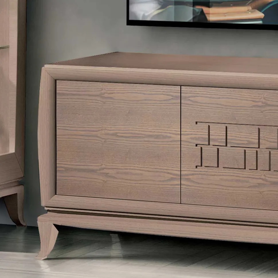 Das Herzstück der Wohnwand bildet das großzügige TV-Board mit den Maßen 151 x 62 x 48 cm. Hinter drei stilvoll gefrästen Türen verbirgt sich jede Menge Stauraum für elektronische Geräte, Kabel oder persönliche Gegenstände. Die grifflosen Fronten sorgen für ein minimalistisches Design, das perfekt in moderne Wohnkonzepte passt. Dank langlebiger Metallbeschläge mit Soft-Close-Funktion schließen die Türen sanft und geräuschlos – ein Komfort, den Sie lieben werden. Getragen wird das TV-Board von einem geschwungenen Vierfußgestell aus massivem Eschenholz, das nicht nur stabil, sondern auch optisch ein Highlight ist.