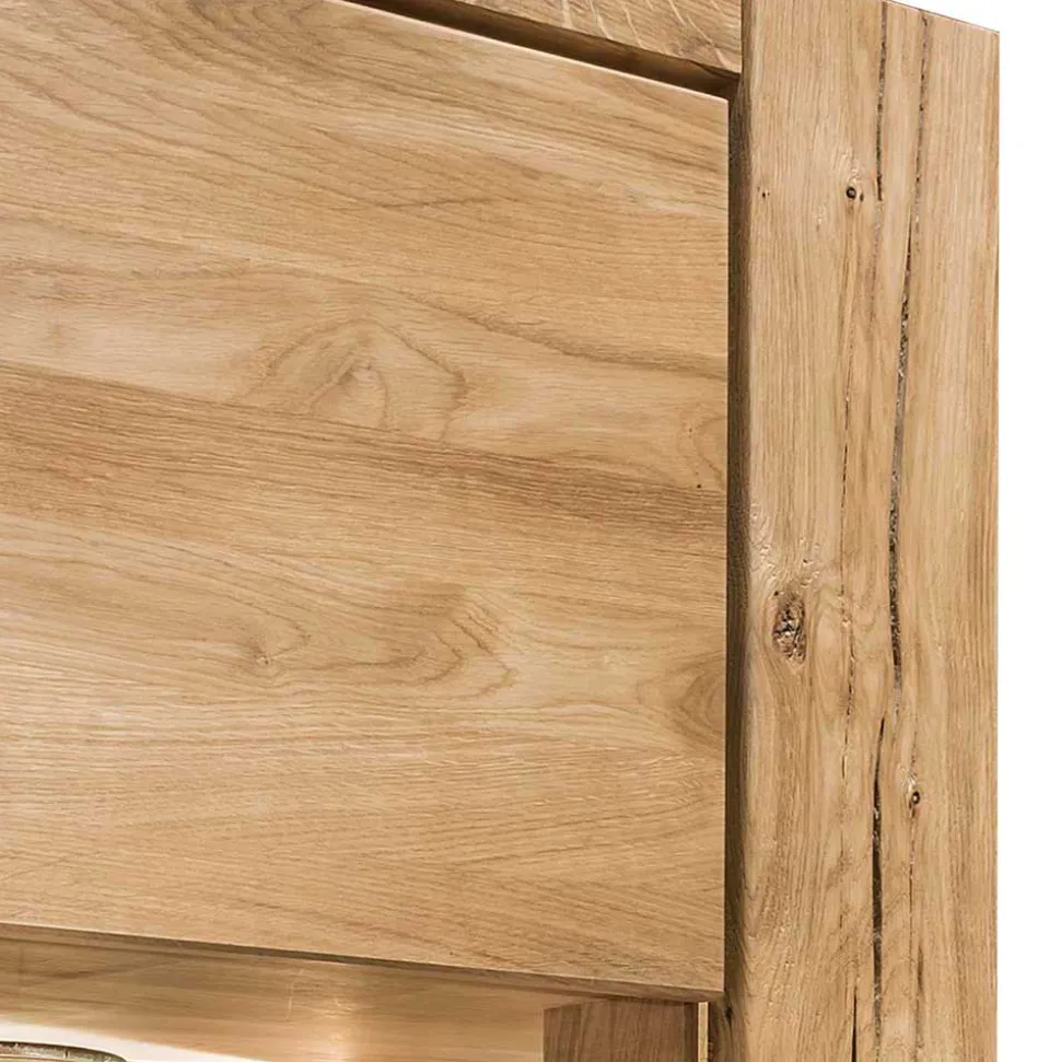 Die Vitrine „Slaraduva“ wurde aus massiver Wildeiche gefertigt, einem Holz, das durch seine besonders harte und dichte Struktur auffällt. Wildeiche ist extrem langlebig, widerstandsfähig und behält seine Schönheit über Jahre hinweg. Die lebhafte Maserung und individuelle Struktur jedes einzelnen Baumes machen jedes Stück dieser Serie zu einem Unikat.