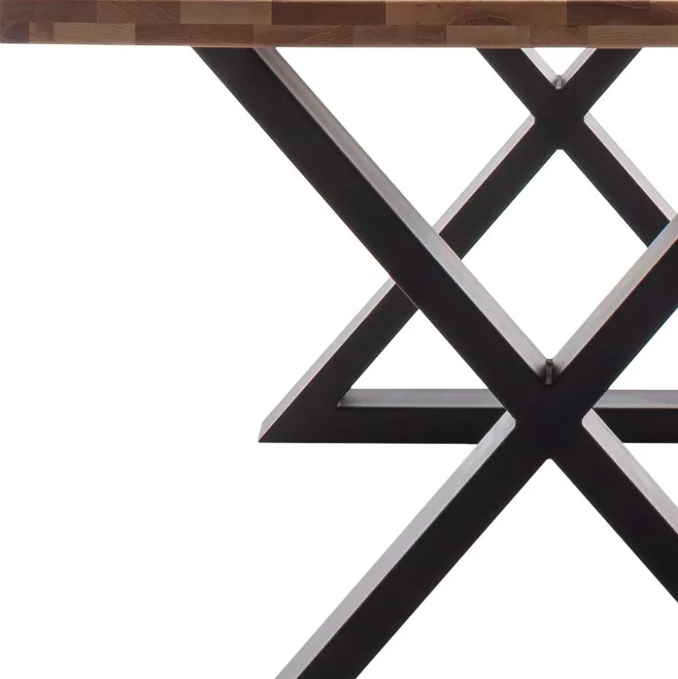 Die Tischplatte des „Yelna“ besteht aus sorgfältig verarbeitetem Zerreiche Massivholz in Lamellenverarbeitung. Zum Schutz und für eine einfache Pflege sind die Massivholzoberflächen geölt. Die markanten X-Füße aus Metall sind mit einer schwarzen Pulverbeschichtung versehen und garantieren Stabilität und Langlebigkeit.
